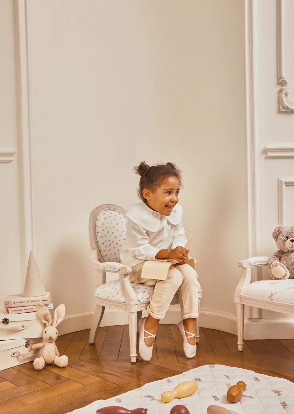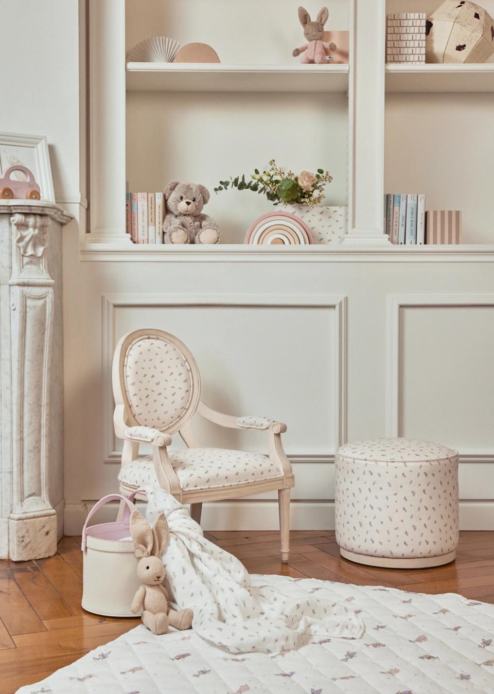 The Heritage Haven Blossom Royal Armchair with upholstered back invites the poetry of an English garden into the nursery. Upholstered in Blossom fabric with delicate florals and bees, it offers a soft, supportive seat finished in Blush White, combining comfort with enduring elegance.