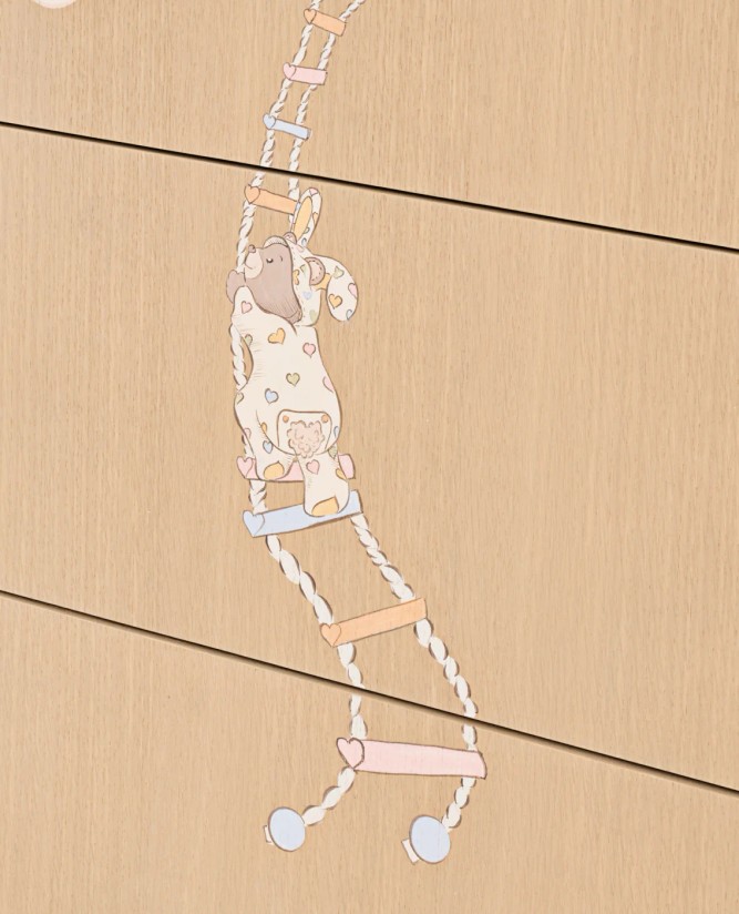 The Honey Cot Extra Large Chest of Drawers – Button & Bunny offers welcome storage wrapped in timeless craftsmanship. Hand-painted characters add gentle storytelling, while the warm honey finish creates a soothing visual setting. Designed to grow with family needs, it blends everyday functionality with enduring nursery style.