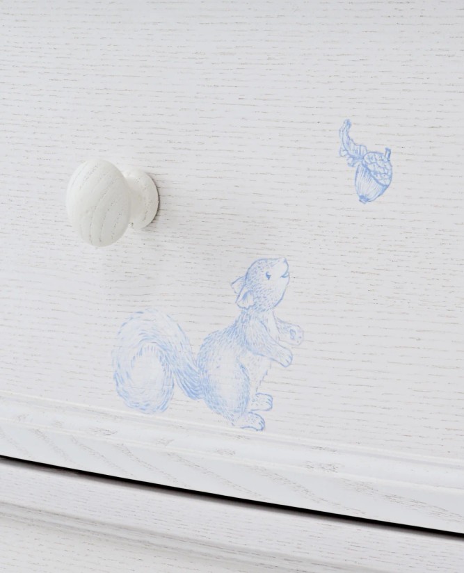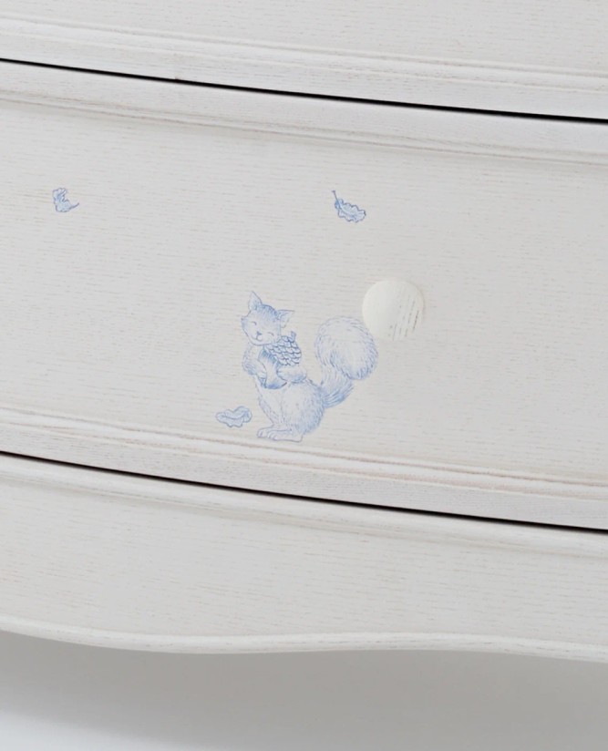 This elegant chest of drawers features hand-painted Blue Toile detailing and a refined white ash finish, offering generous storage while bringing timeless French-inspired charm to the nursery.