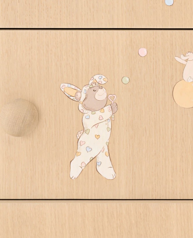 This large chest of drawers features hand-painted Button & Bunny detailing and a warm honey finish, offering generous storage wrapped in playful, timeless charm.