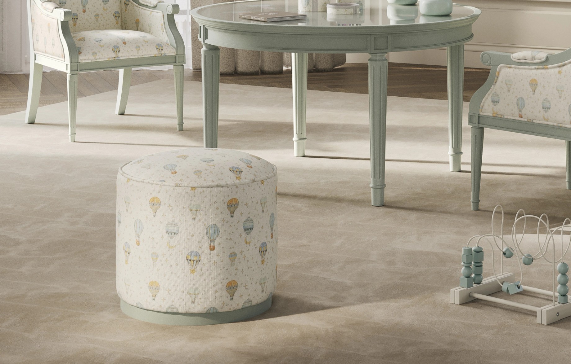 The Heritage Haven Ottoman in Moonlight Voyage is a playful yet practical accent piece. Upholstered in Moonlight Voyage fabric and featuring celestial motifs, it adds softness and charm to the nursery. Light and easy to move, it offers flexible seating while maintaining refined craftsmanship.