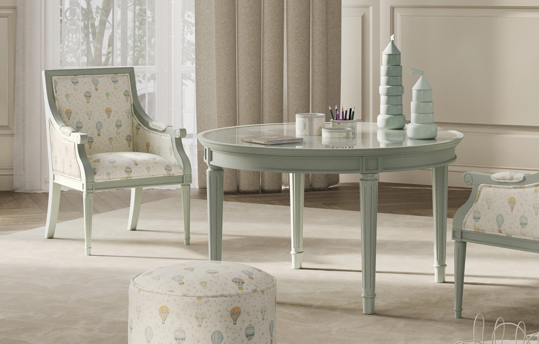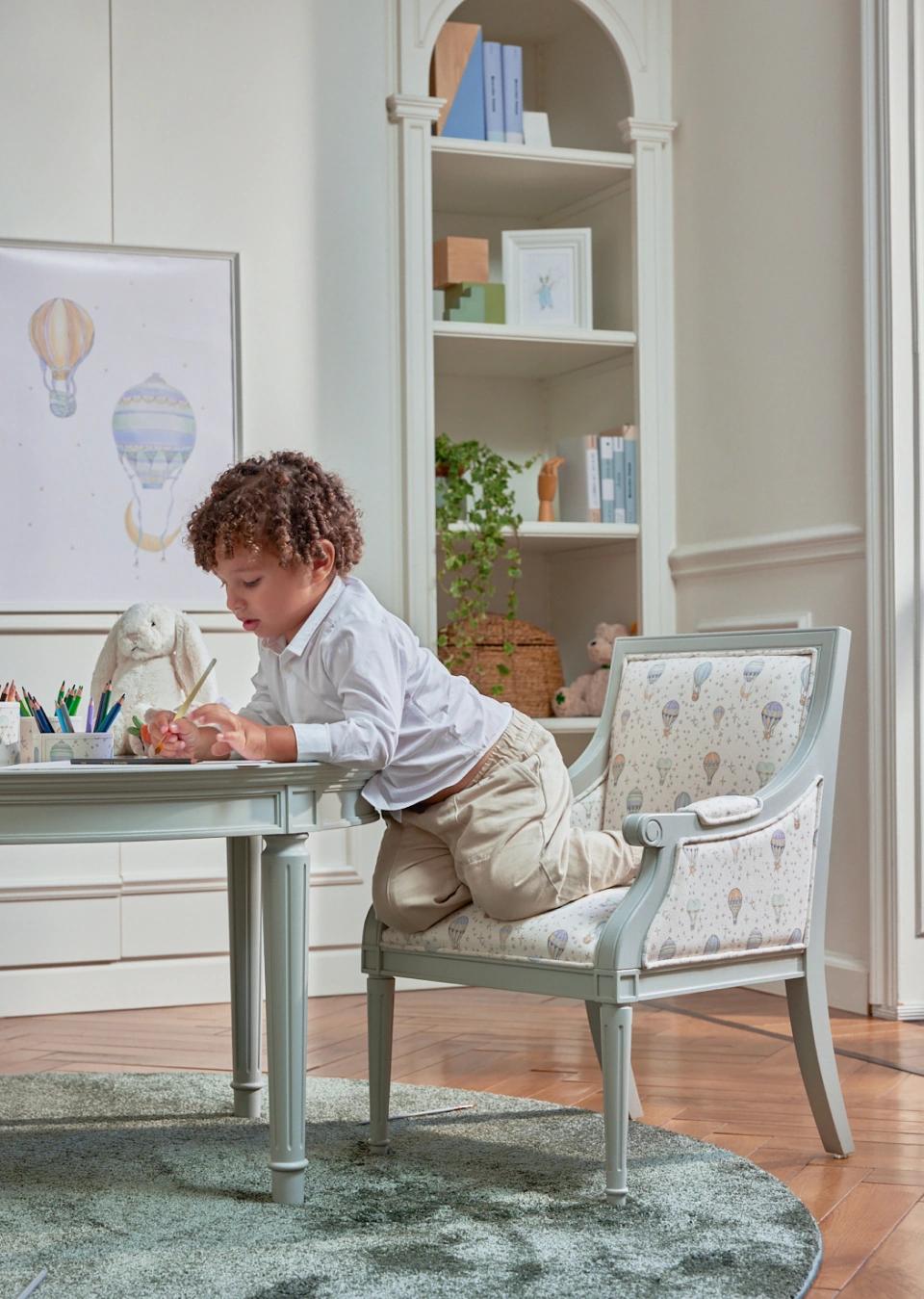 This elegant royal armchair features Moonlight Voyage upholstery and a refined Silky Sage finish, offering a comfortable and story-filled seating piece designed for calm nursery moments.