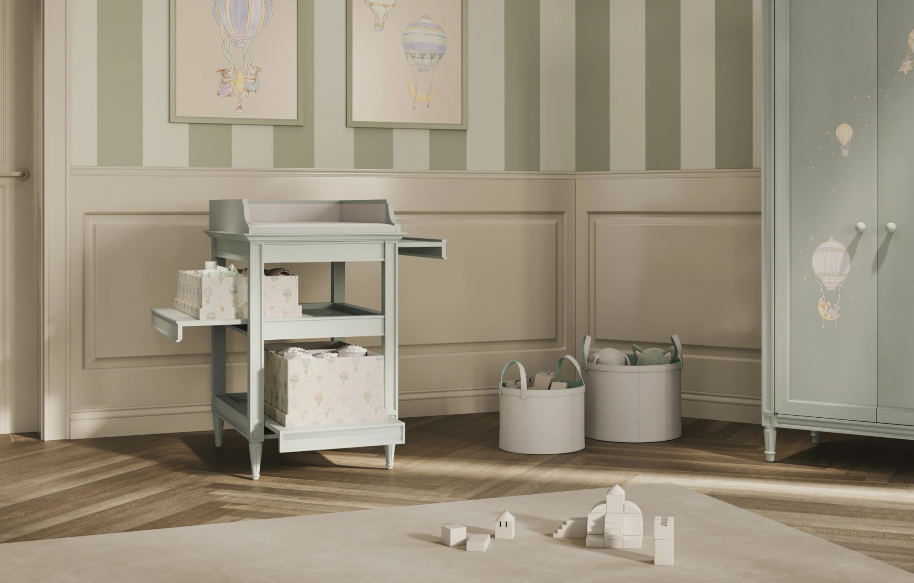 Designed to bring calm and order to everyday routines, this nursing table features multiple storage trays and a soft Silky Sage finish, combining thoughtful functionality with refined design.