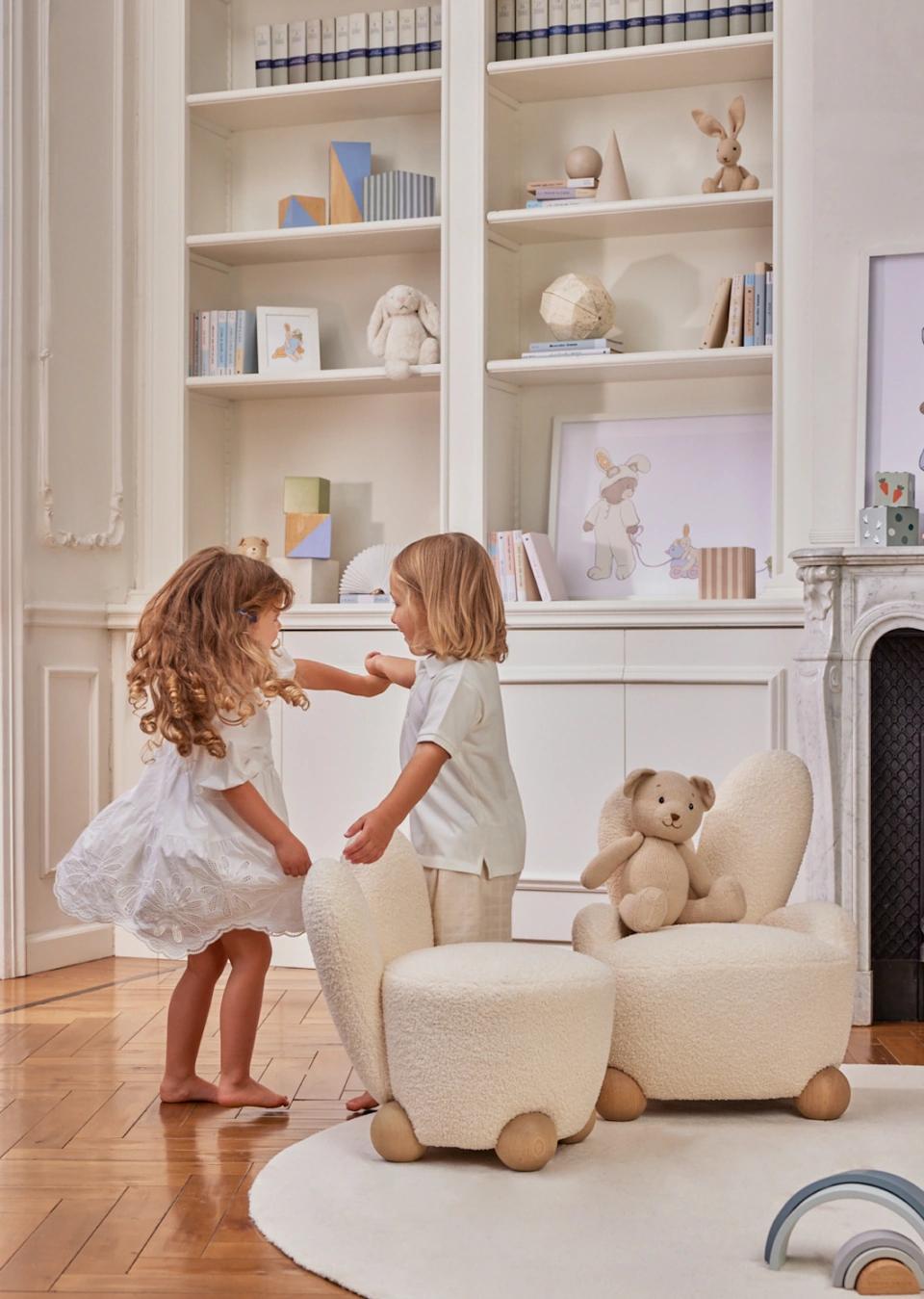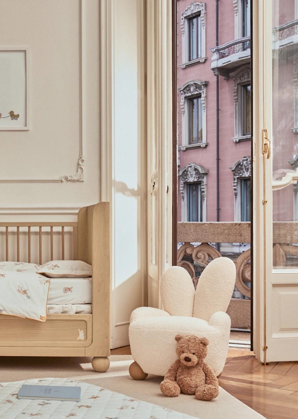 A whimsical rabbit armchair with charming details and a warm honey finish, designed as a playful and functional seating piece for children.