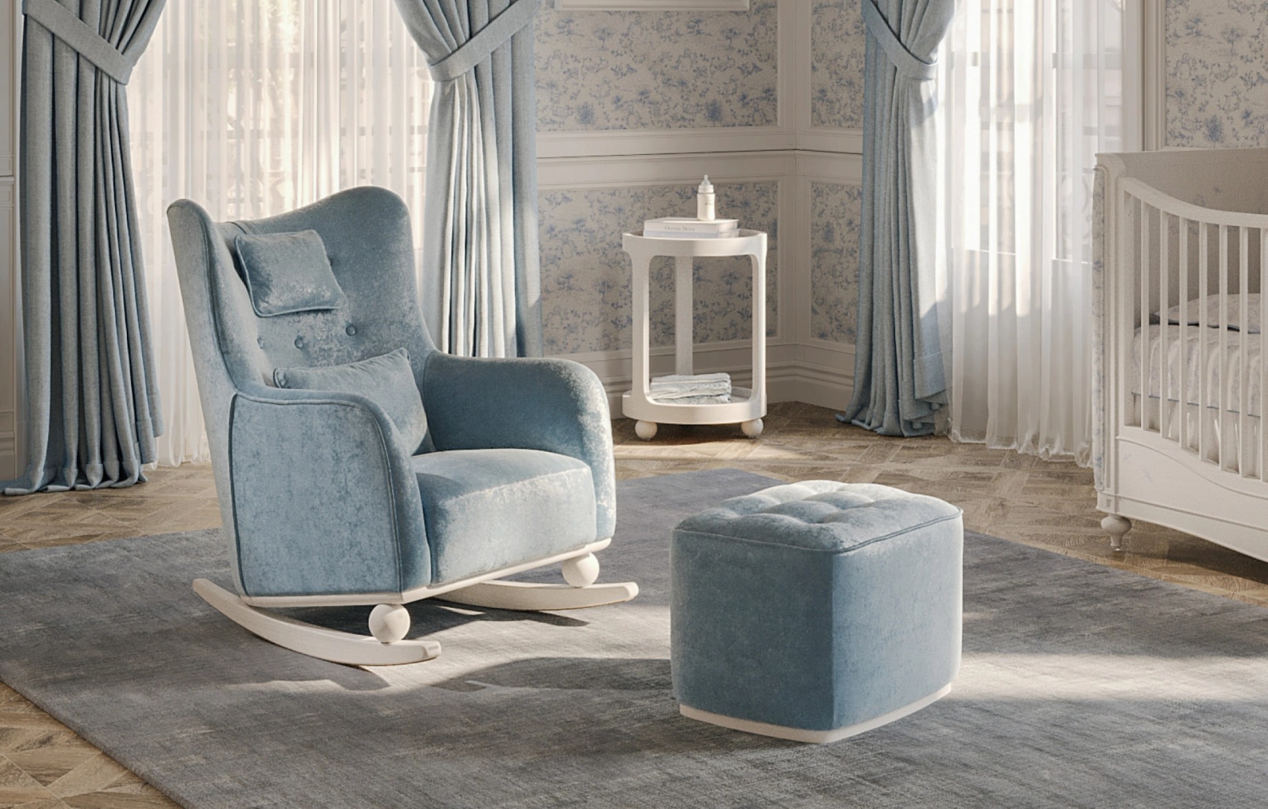 This soothing rocking armchair features a refined silhouette and Blue Toile upholstery, creating a calm and comfortable seating space for feeding, bonding and rest.