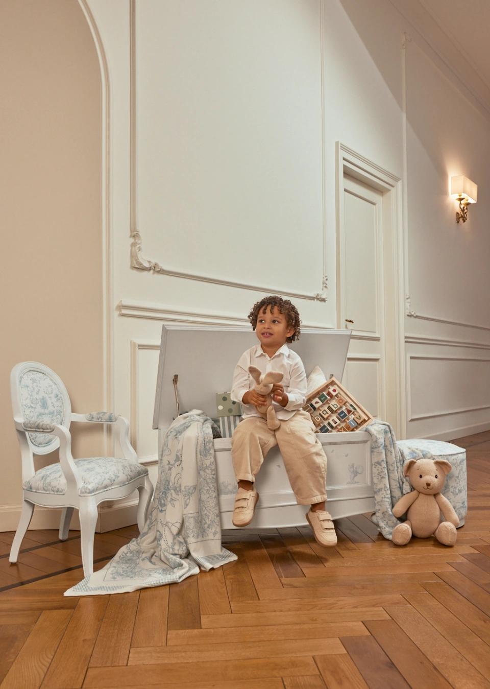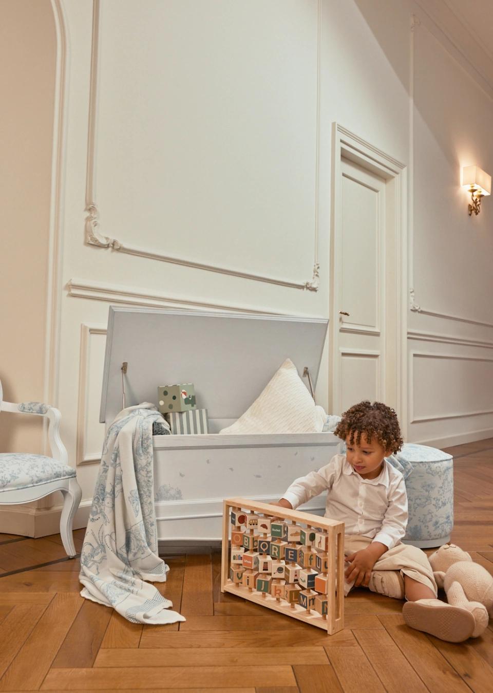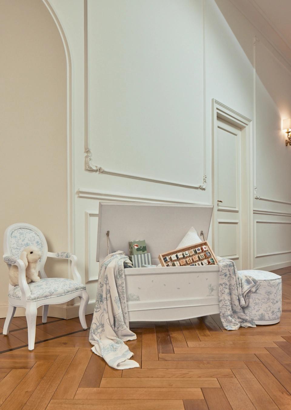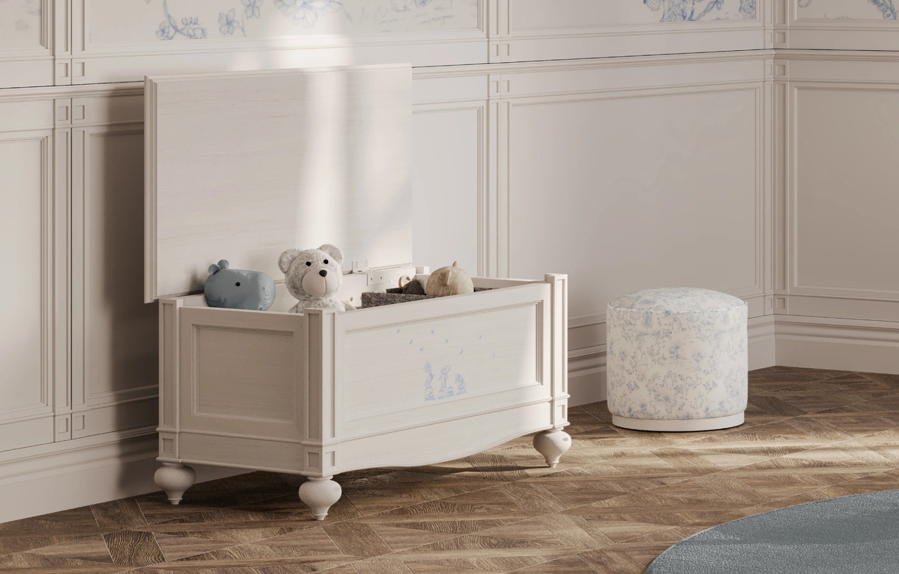 The Petit Palais Treasure Trunk in Blue Toile is crafted to hold cherished childhood keepsakes. Hand-painted toile motifs add playful charm, while the soft-close lid ensures gentle everyday use. A beautifully balanced piece blending function and storybook elegance.