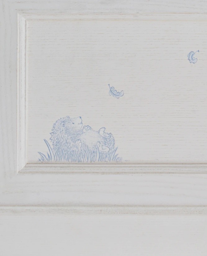 This charming storage trunk features hand-painted Blue Toile detailing and a soft-close lid, offering a timeless and practical solution for nursery storage.