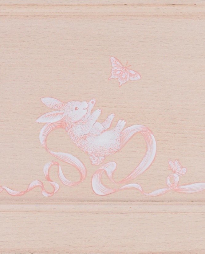 This charming storage trunk features hand-painted Pink Toile detailing and a soft-close lid, offering a timeless and practical solution for nursery storage.