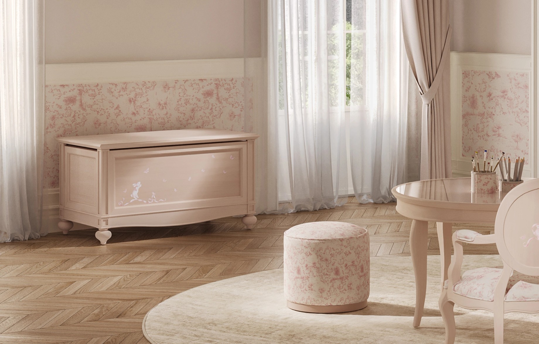 The Petit Palais Treasure Trunk in Pink Toile is designed to hold cherished childhood keepsakes. Hand-painted toile motifs add playful charm, while the soft-close lid ensures gentle everyday use. A beautifully balanced piece blending function and storybook elegance.