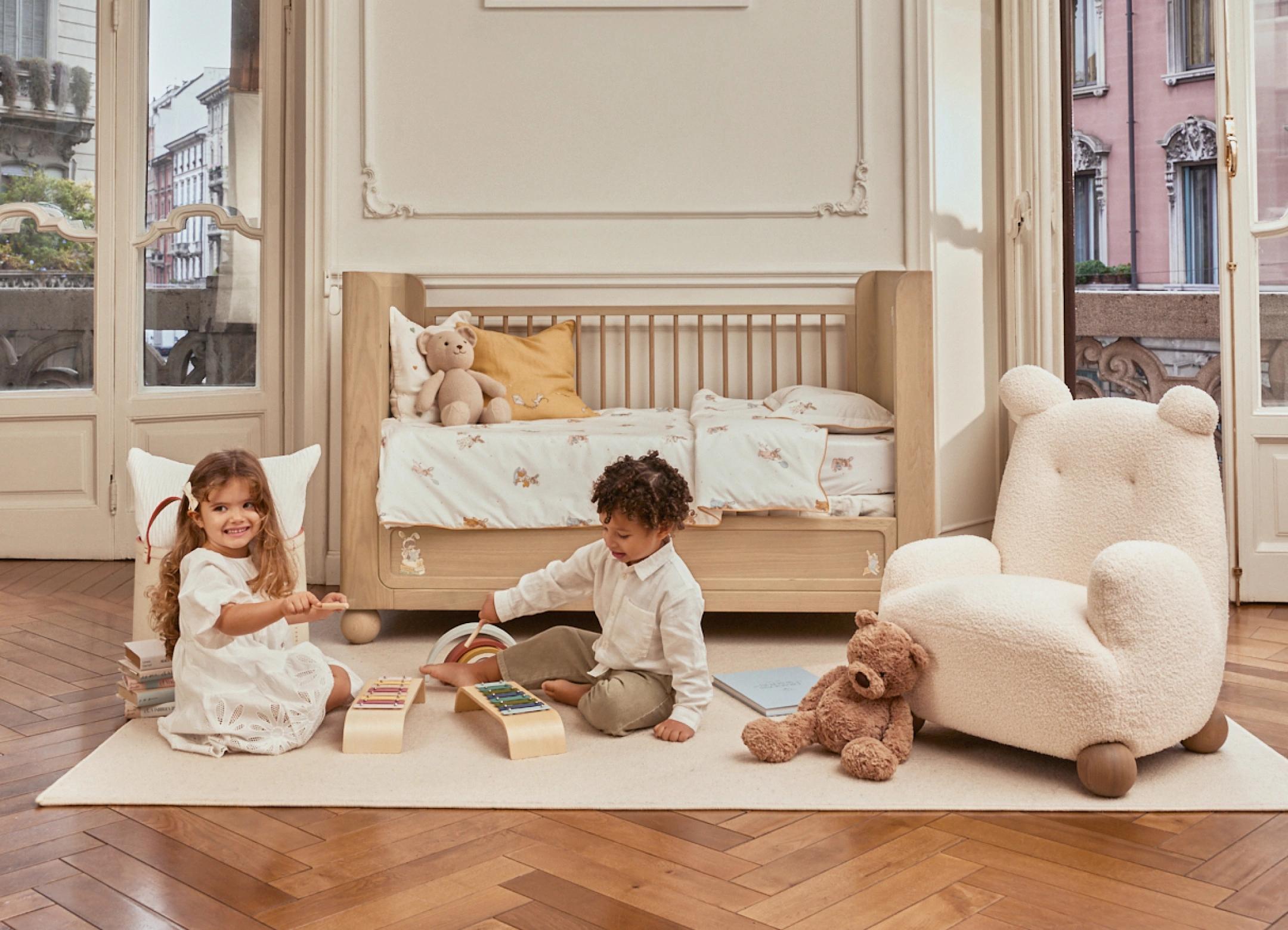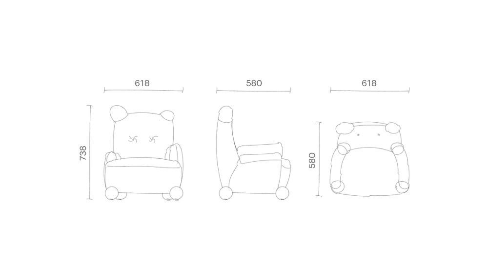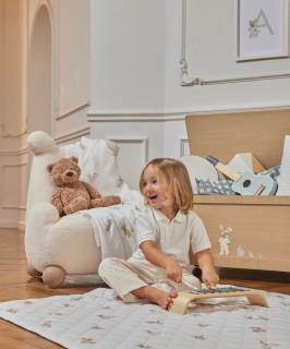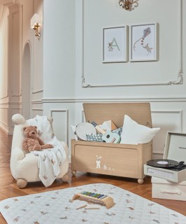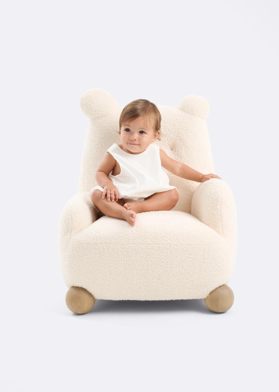 This teddy armchair features playful proportions and a warm honey finish, offering a cosy and charming seating piece inspired by childhood comfort.