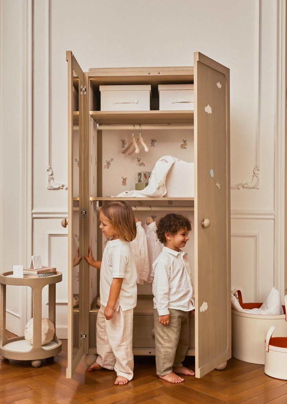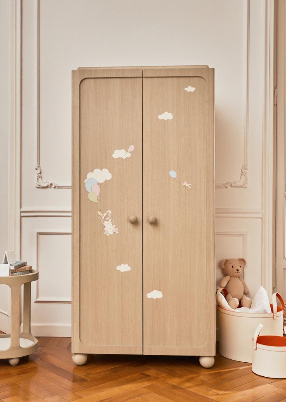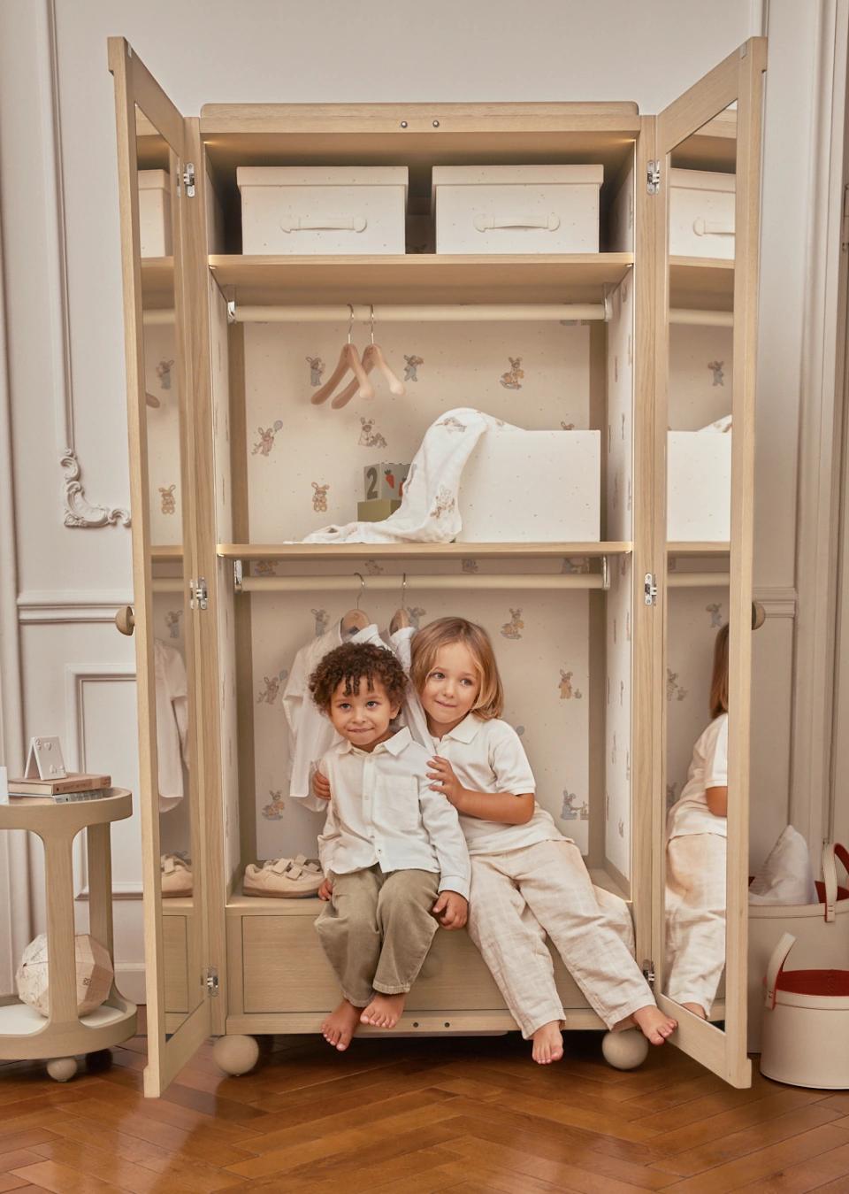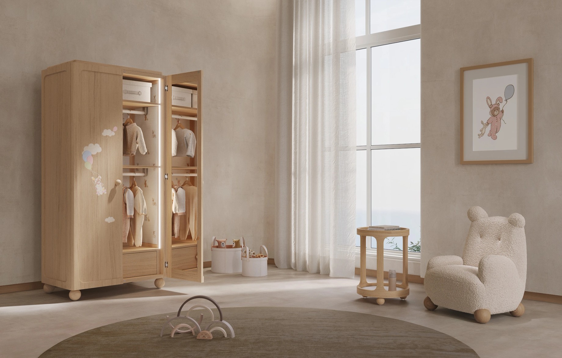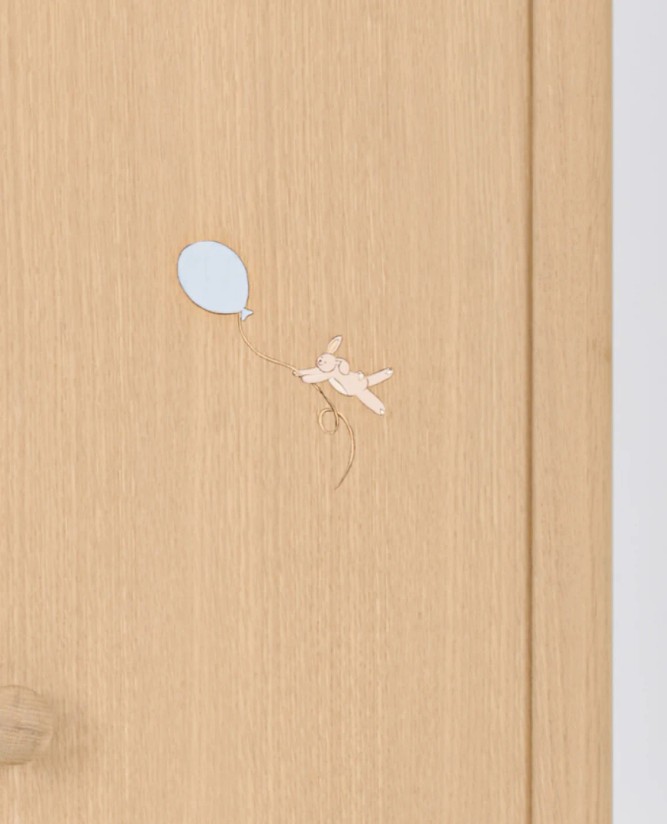 A refined nursery wardrobe featuring hand-painted Button & Bunny detailing, offering elegant and thoughtfully designed storage with a warm honey finish.